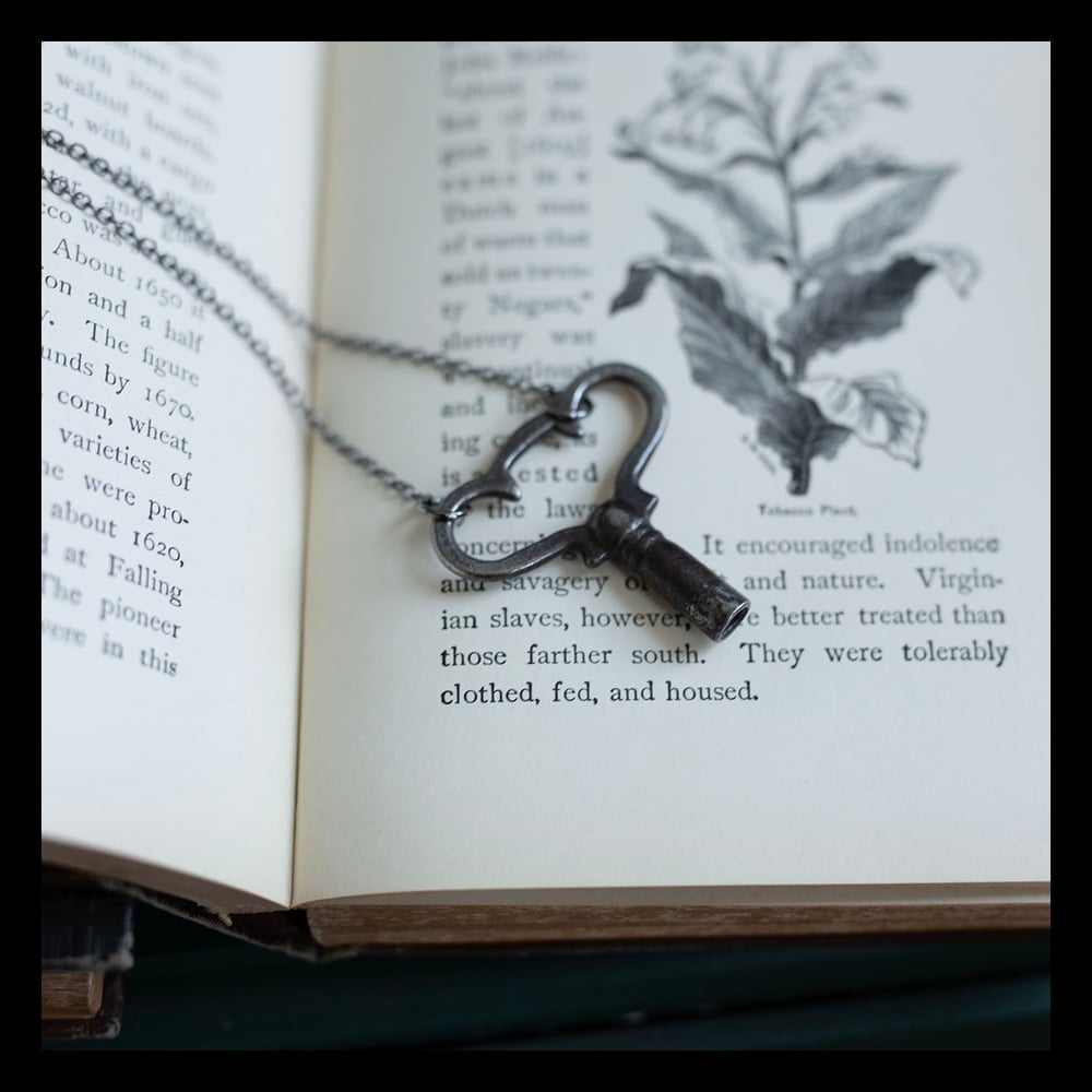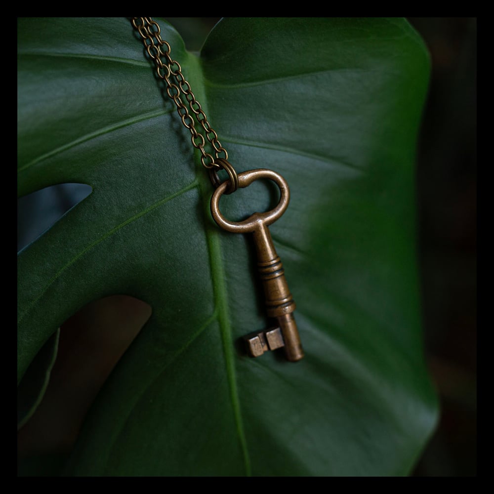 Skeleton key with bead & vintage clock parts vial with dried rosebud